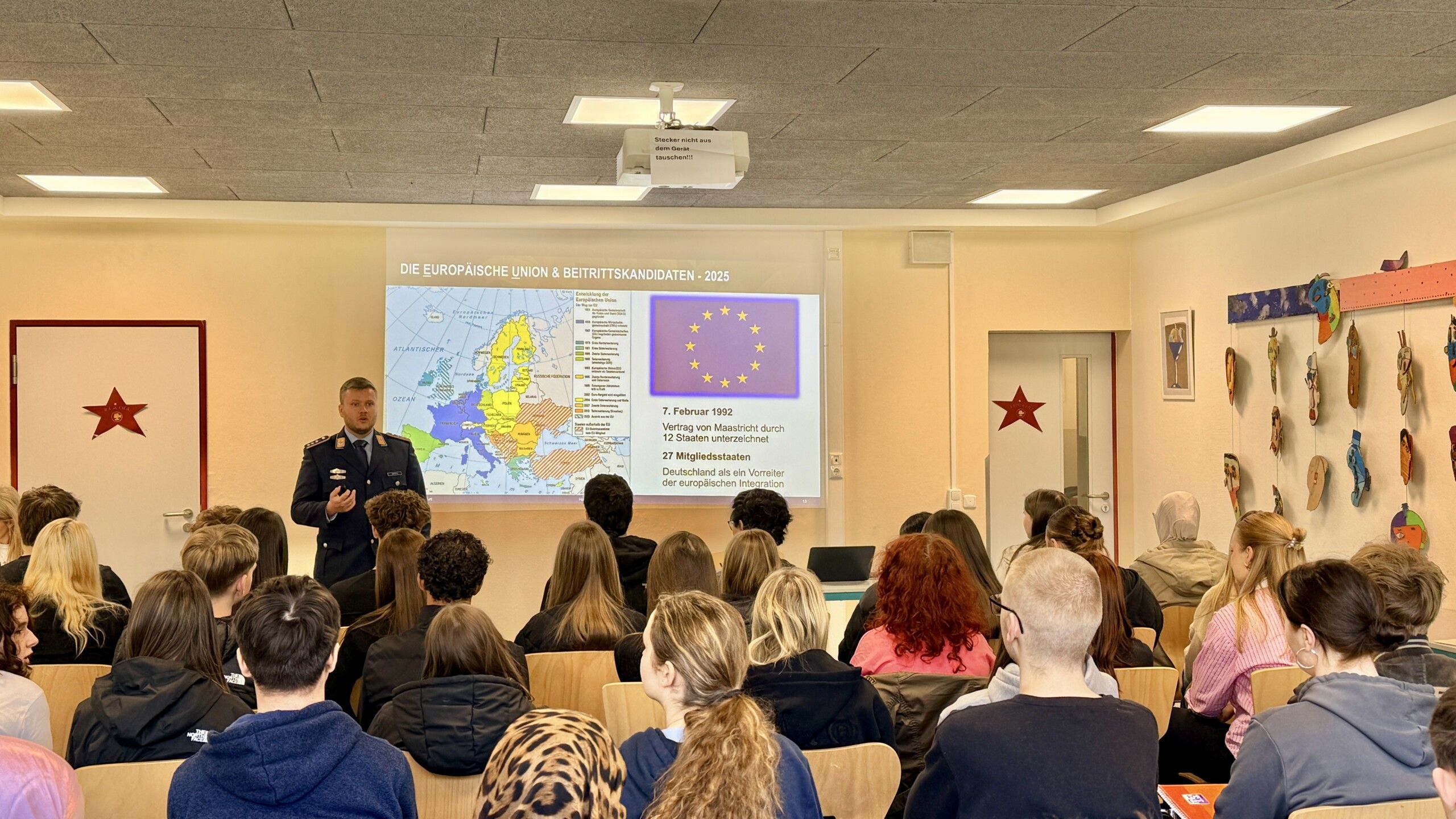 Darüber hinaus erhielten sie Einblicke in die aktuelle Sicherheitspolitik sowie in die Aufgaben der Bundeswehr im nationalen und internationalen Kontext. Auch historische Bezüge wurden hergestellt: am Beispiel des Kalten Krieges wurde deutlich, wie Propaganda und Informationskontrolle bereits in der Vergangenheit eine zentrale Rolle spielten. Die Veranstaltung diente zugleich der Vorbereitung auf die anstehende Exkursion zur Gedenkstätte Point Alpha in der kommenden Woche. Die Schülerinnen und Schüler konnten so bereits wichtige inhaltliche Grundlagen erarbeiten, die ihnen helfen werden, die historischen Zusammenhänge vor Ort besser einzuordnen.
