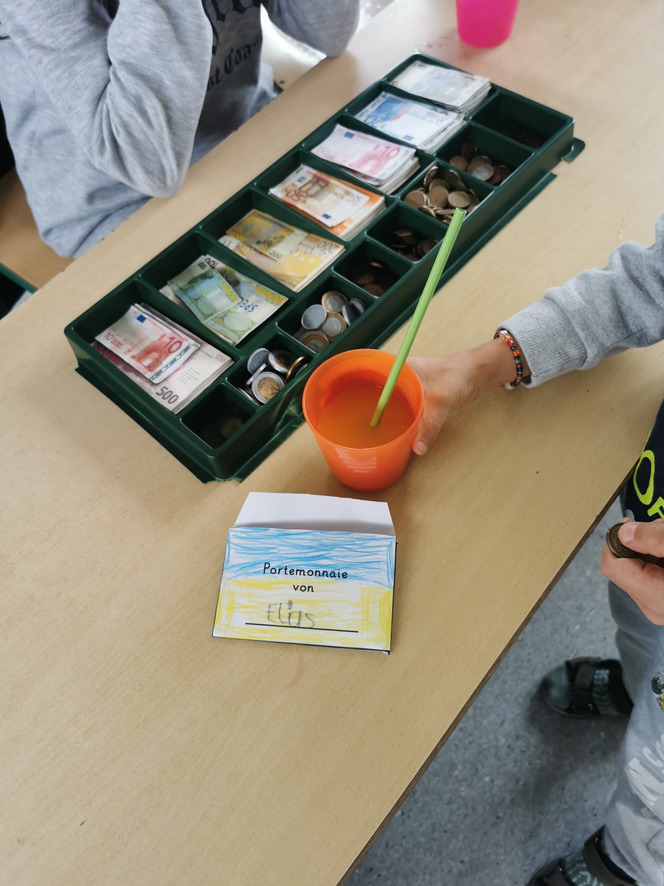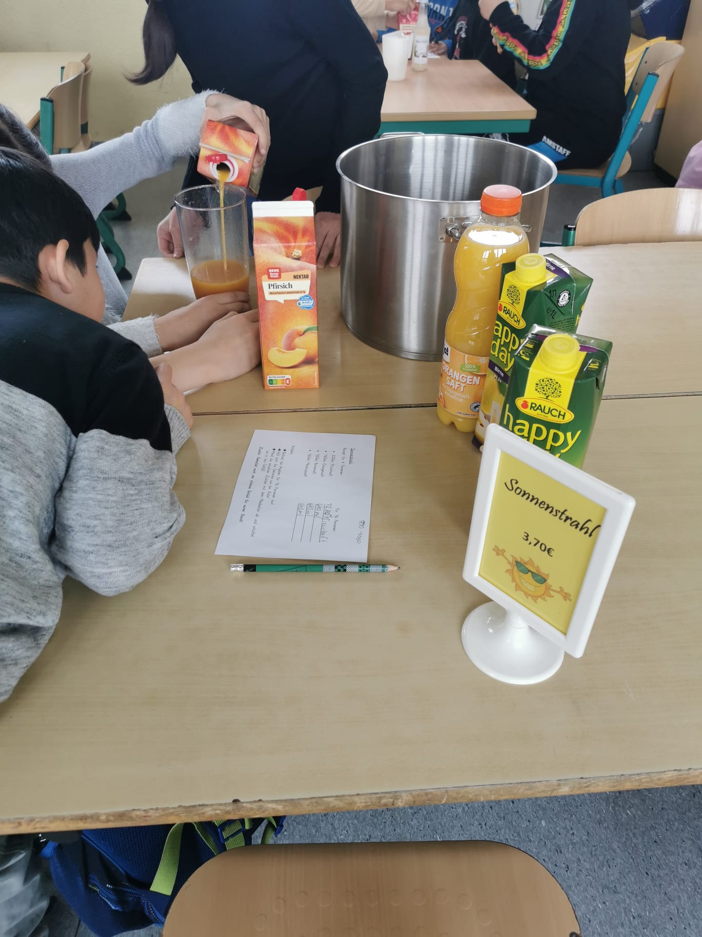 Im Mathematikunterricht des Lernhauses B2 dreht sich gerade bei der Klassenstufe 3/4 alles um das Thema „Hohlmaße“. Um dabei das Angenehme mit dem Nützlichen zu verbinden, wurden in dieser Woche Cocktails gemixt. Die Schüler und Schülerinnen mussten zuerst die richtigen Mengenangaben ausrechnen, sich die passenden Säfte heraussuchen und schließlich alles genau ausmessen. Klassenstufe 1/2 bastelte sich in der Zeit ein eigenes Portemonnaie mit Spielgeld, um sich bei den Großen einen köstlichen Cocktail auszusuchen und „zu kaufen“. Alle Kinder waren mit viel Begeisterung dabei und ließen es sich schmecken.